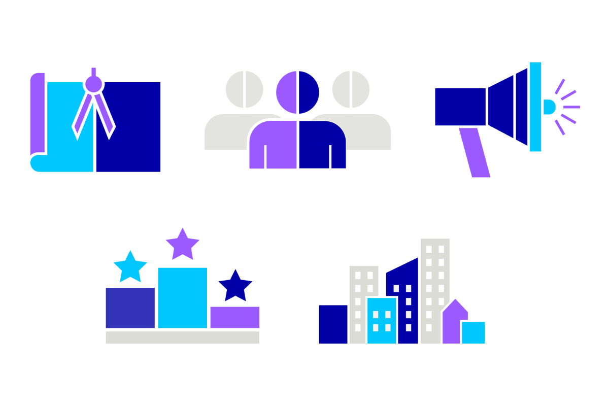 Auch bei den Grafiken im Corporate Design der DSG werden verschieden farbige Blöcke miteinander kombiniert.